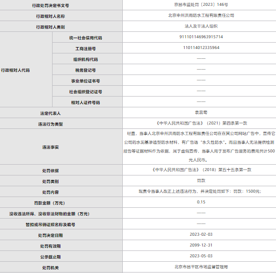 根据处罚信息,申州洪雨在其公司网站广告中,宣传它公司的水泥基渗透型防水材料,有广告语“永久性防水",但该公司无法提供检测报告等证据材料作为依据,属于虚假宣传,申州洪雨用于发布广告服务的费用共计500元。