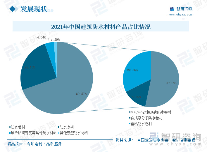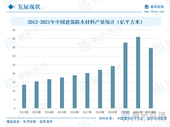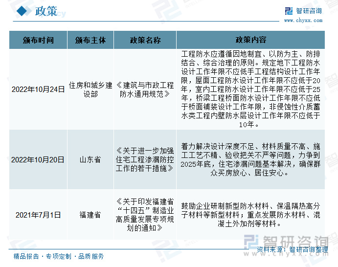 以上数据及信息可参考智研咨询发布的《2023-2029年中国建筑防水材料行业市场运行格局及战略咨询研究报告》。智研咨询是中国产业咨询领域的信息与情报综合提供商。公司以“用信息驱动产业发展,为企业投资决策赋能”为品牌理念。为企业提供专业的产业咨询服务,主要服务包含精品行研报告、专项定制、月度专题、可研报告、商业计划书、产业规划等。提供周报/月报/季报/年报等定期报告和定制数据,内容涵盖政策监测、企业动态、行业数据、产品价格变化、投融资概览、市场机遇及风险分析等。