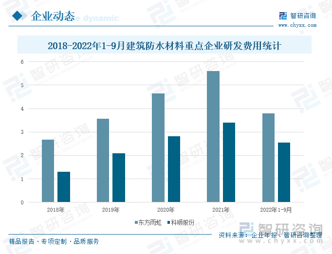从企业的研发费用来看,2022年1-9月,东方雨虹的研发费用为3.79亿元,同比增长18.65%;科顺股份的研发费用为2.55亿元,同比下降3.97%。2022年1-9月,东方雨虹公司不断加大研发费用投入,在美国成立“东方雨虹防水涂料全球卓越研究中心”,其“HWR101高耐水超柔防水涂料”分别获得美国专利商标局、 印度专利局颁发的发明专利证书,“TKB-210太空堡耐候自粘沥青防水卷材” 获得国家发明专利,企业的研发力量和科研能力均处于同行业的领先水平;科顺股份利用环保型聚氨酯涂料研制技术,研发并推出了“去溶剂化”防水涂料。