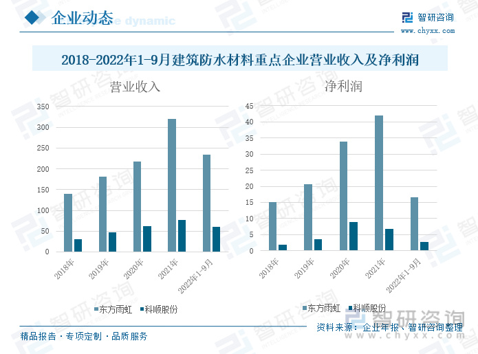 从营业收入来看,东方雨虹的营业收入要远高于科顺股份,据企业年报,2022年1-9月,东方雨虹的营业收入为233.79亿元,同比增长3.07%;科顺股份的营业收入为59.57亿元,同比增长4.82%,两家企业的营业收入均呈现上涨趋势。2022年上半年,国内新冠肺炎疫情反复、房地产需求低迷,超预期突发因素给经济发展带来严重冲击,对企业的营收造成一定影响,但两家公司积极应对风险,采取相对的措施,实现了经营业绩的良好发展。