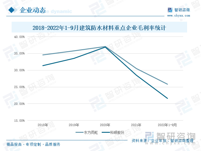 三、企业格局:企业纷纷承压运行,建筑防水材料毛利率逐年下降