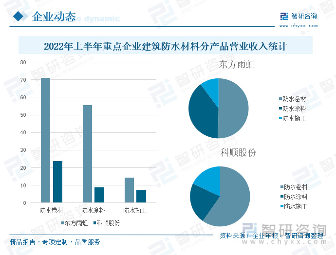 企业年报显示,2022年上半年,东方雨虹防水卷材的营业收入为71.03亿元,同比增长1.13%,防水涂料为55.66亿元,同比增长19.86%,防水施工14.39亿元,同比增长0.66%;科顺股份防水卷材的营业收入为23.86亿元,同比增长21.03%,防水涂料为8.93亿元,同比增长8.11%,防水施工7.14亿元,同比增长4.75%。从建筑防水材料产品营业收入占比来看,东方雨虹防水卷材占比46.41%,防水涂料占比36.36%,防水施工占比9.40%;科顺股份防水卷材占比57.62%,防水涂料占比21.56%,防水施工占比17.23%。