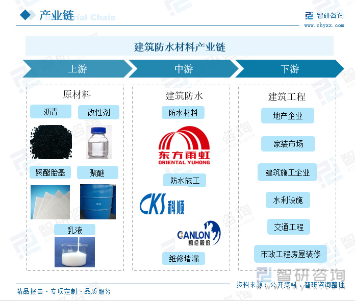 建筑防水材料产业链的上游原材料包括沥青、改性剂、聚酯胎基、聚醚、乳液等;下游主要应用于建筑工程,囊括地产企业、家装市场、建筑施工企业、水利设施、交通工程和市政工程房屋装修;中游为建筑防水材料产业,其可以分为防水材料、防水施工、维修补漏三个部分,代表性企业有东方雨虹、科顺股份、凯伦股份、亚士创能等等。